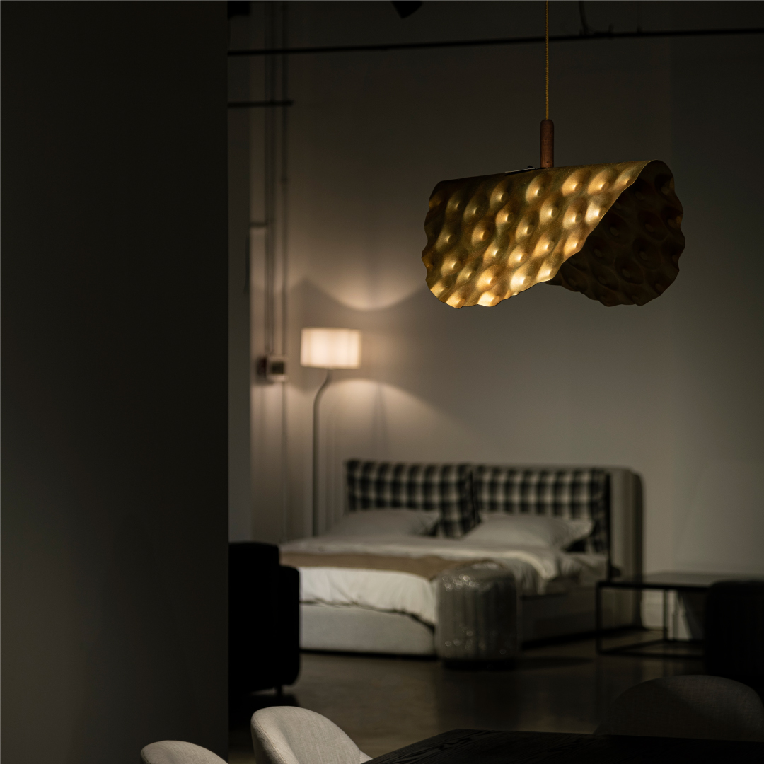 آویز روشنایی مدرن گلدنمون یک روشنایی مینیمال با فرمی منحصر به فرد است. ظاهر بصری این روشنایی مدرن الهام گرفته از حفره های روی سطح کره ماه است. و میتوان اینگونه تصور کرد که ایلکین در نوآورانه ترین طراحی خود ماه را از دو طرف خم کرده است.